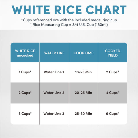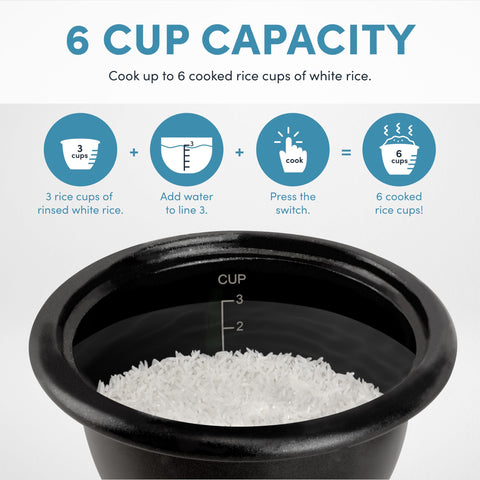 - PERFECT EVERY TIME: This non-stick pot has convenient measuring lines, and the appliance manual is filled with cooking tips. Just add rice first, then fill to the water line.
