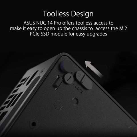 Details: ASUS NUC 14 Pro Slim Barebone with Intel 14th Gen Core Ultra 5 125H (NPU Support), Up to 96GB DDR5 RAM, Dual Storage Design, Thunderbolt™ 4, Wi-Fi 6E & Bluetooth 5.3, Toolless Chassis Access, with VESA Mount included