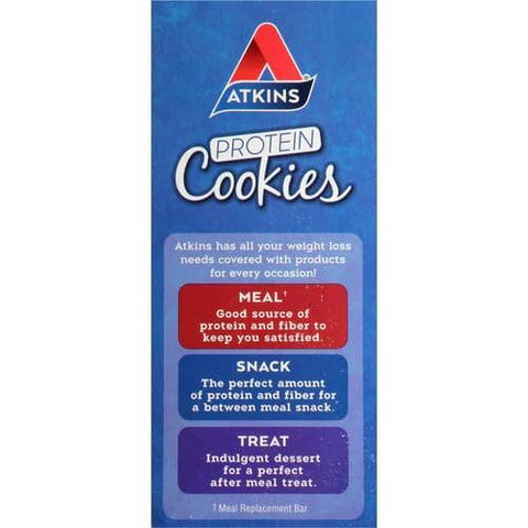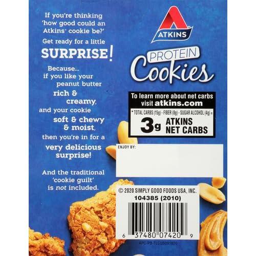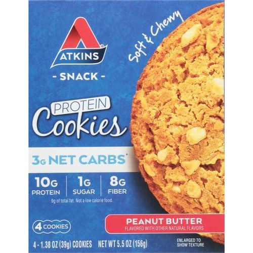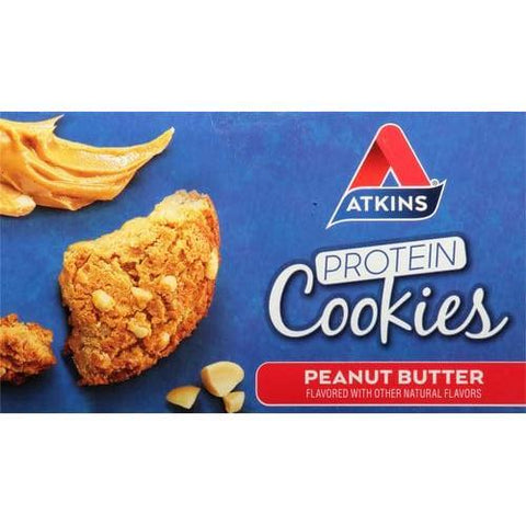 - AT HOME OR ON-THE-GO. Atkins Peanut Butter Protein Cookies. Enjoy delicious cookies that fit right into your busy schedule, with 10g of protein, 3g of net carbs, and 1g of sugar per cookie*. This is Today’s Atkins.
