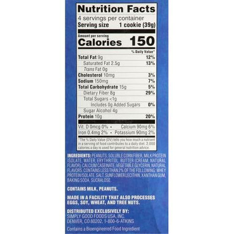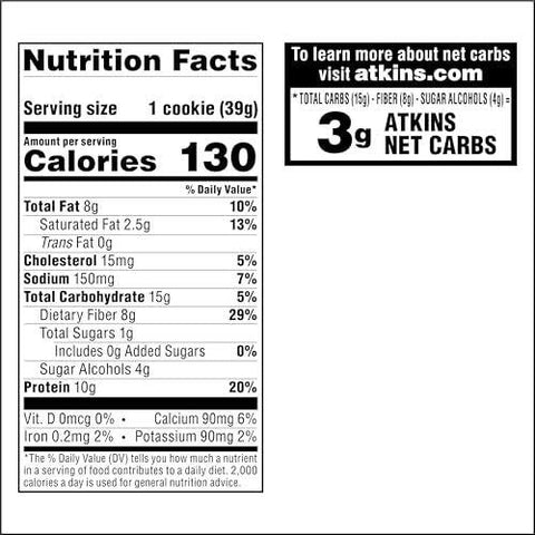 Details: Atkins Peanut Butter flavored Protein Cookies are a great way to treat yourself to a soft and chewy snack. These low carb*, low sugar* cookies provide you with the sweet taste you want from a cookie. Satisfy your sweet tooth with the rewarding taste of Atkins Peanut Butter flavored Protein Cookies. It’s the great taste of peanut butter in a soft and chewy protein cookie that’s keto friendly*, rich in fiber*, with 10g of protein, 3g of net carbs, and 1g of sugar per serving*. *See Nutrition Information for Saturated Fat Content. Fiber: 8g Total Fat per serving. Low Carb: 15g Total Carbs, 3g Net Carbs per serving. Low Sugar: 1g Total Sugar per serving. Not a low calorie food. Keto Friendly: When used with Atkins ketogenic programs.