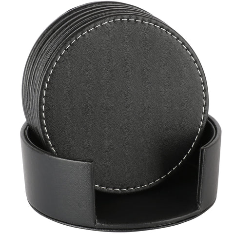 - MODERN DESIGN:Leather coasters set with holder(6 pcs per set). Well selected double-deck PU leather for better heat insulation and durable use. Each side is leather and sewn together by white thread which looks really nice, fashionable and luxury.