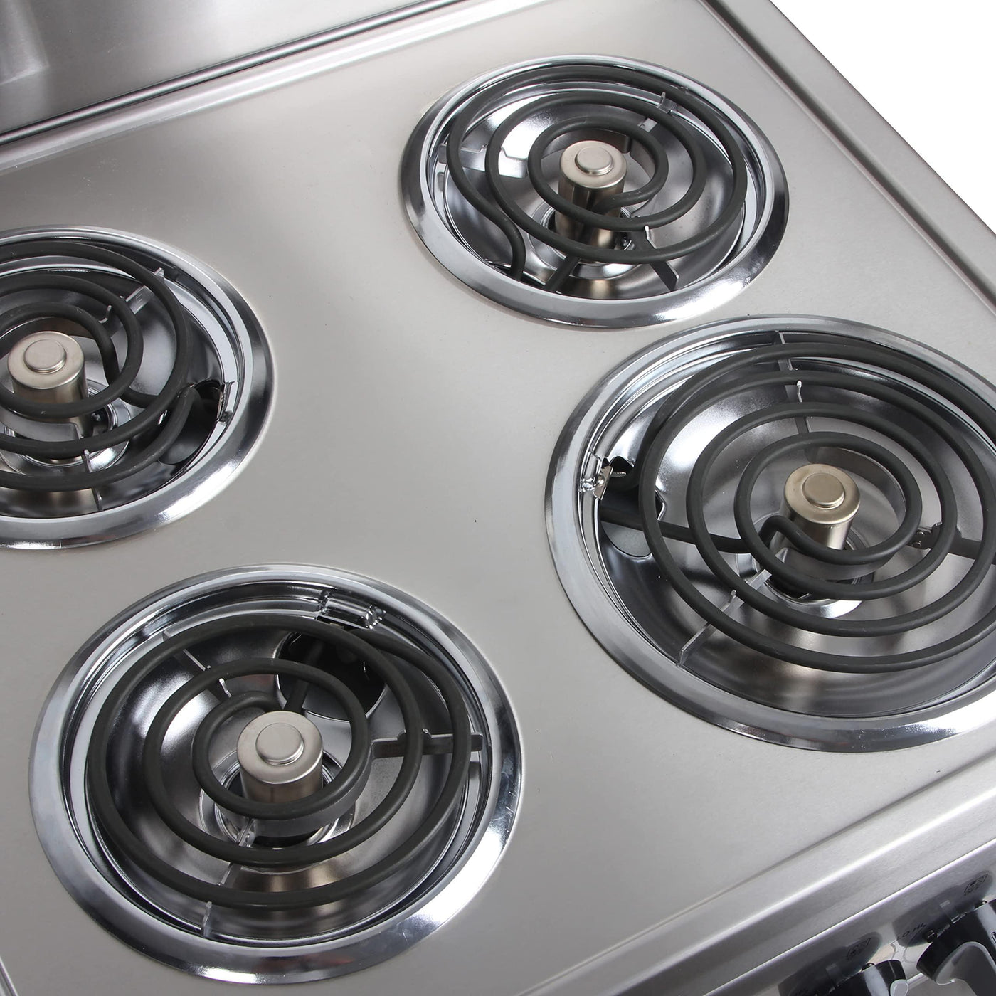 Details: Save kitchen space with this compact, white range from Avanti. The perfect compact electric range for the office, studio apartment, RV, tiny home, condo, vacation home, or anywhere you need to save space in a small kitchen. This 24-inch wide range features 4 coil burners (three 6" and one 8"). The oven has a pull-out storage drawer with a handle at the bottom, and a broiler that comes with a broiling pan.