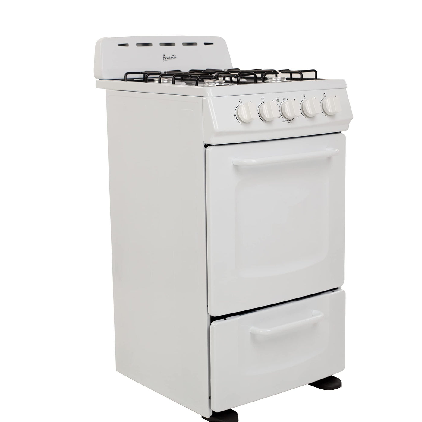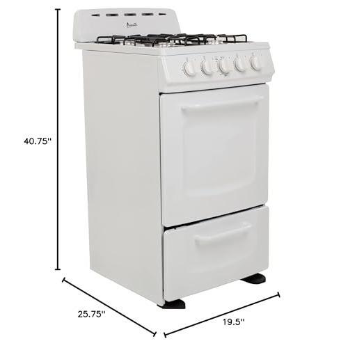 Details: The Avanti 20-Inch Gas Range Oven in white is the ideal space-saving solution for compact kitchens, studio apartments, RVs, and vacation homes. With a 2.1 cu. ft. oven capacity and four 9,000 BTU burners, this freestanding gas range offers exceptional performance and versatility. The oven features a solid metal door, two racks, and a broiler drawer with a 10,000 BTU broiling pan, making it perfect for various cooking needs. Additional features include a bottom storage drawer, full-range temperature control, and a 60-minute timer for ease of use. Built for safety and reliability, it includes a backsplash with integrated oven vents, an LP conversion kit, and ADA compliance. Backed by Avanti's 1-Year Manufacturer Limited Warranty, this range is both functional and durable for any small kitchen.