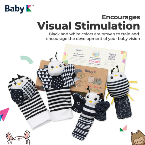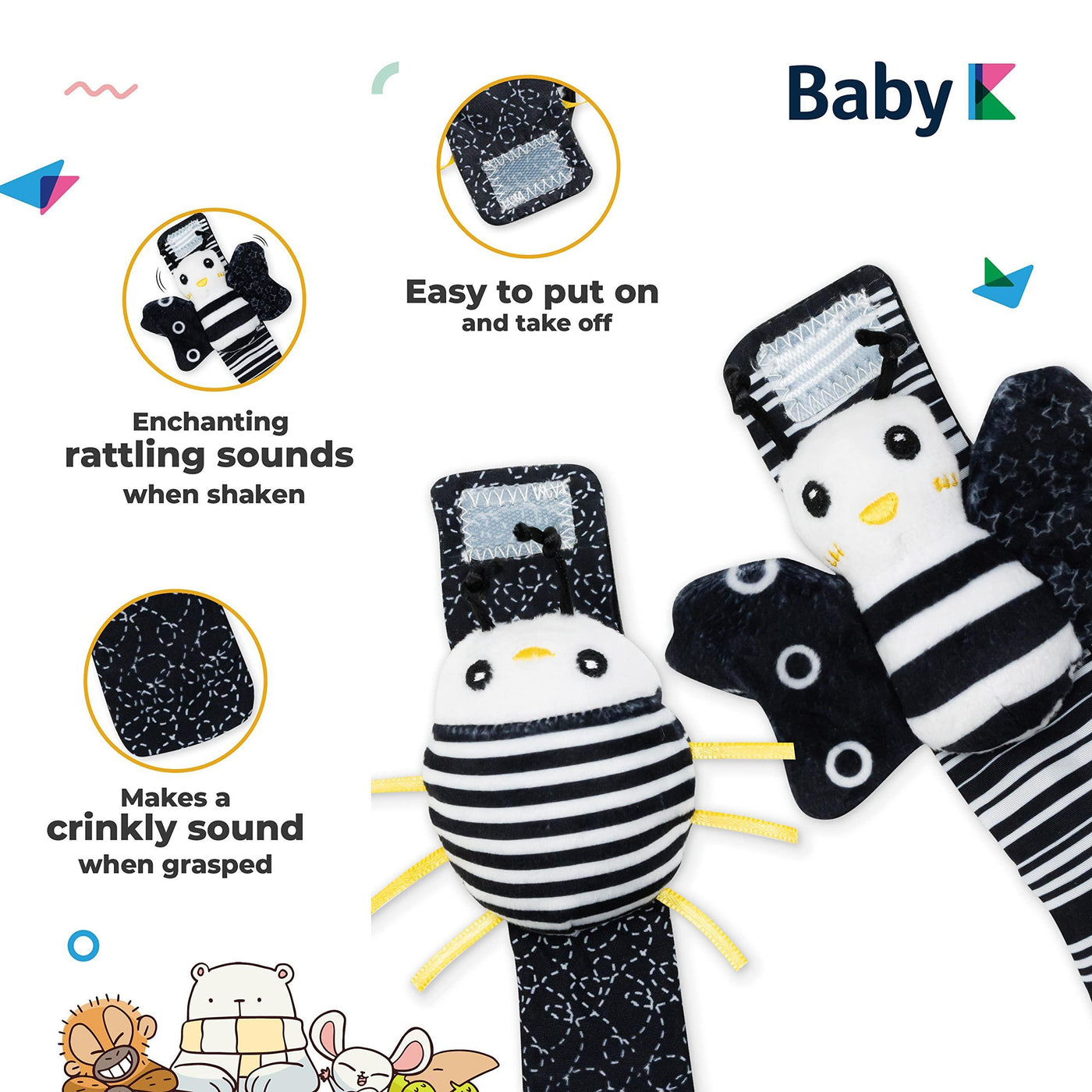- ๐ง STIMULATES BABY'S SENSES - Our black and white monochrome wrist rattles for infants help stimulate your little one's visual development. With adorable crinkling bug friends attached to each wearable rattle, these baby toys are sure to keep them entertained for hours on end.