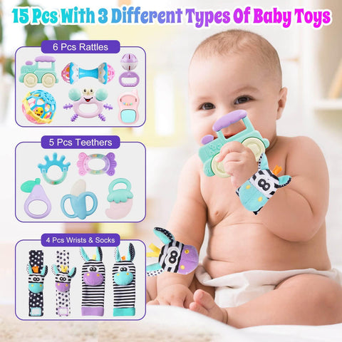 - 💖【15PCS Rattles Teethers Set】Including three common types of baby toys: rattles, wrist socks and teethers, no need search for each of them. Our rattles are designed with multiple easy-grip handles, lovely shapes, and a perfect size for little hands to grab and shake, help babies to explore and engage with their surroundings.