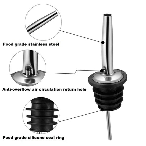 - 5.OIL BOTTLE SPOUT WITH DUST CAPS: These Stainless Steel liquor bottle pourers are supplied with a sealed dust caps, which maintain food hygiene, but also effectively seals the spout, insulates the air, and extends the shelf life of the food.