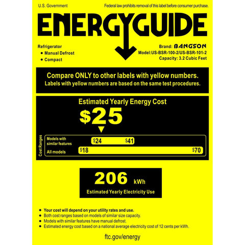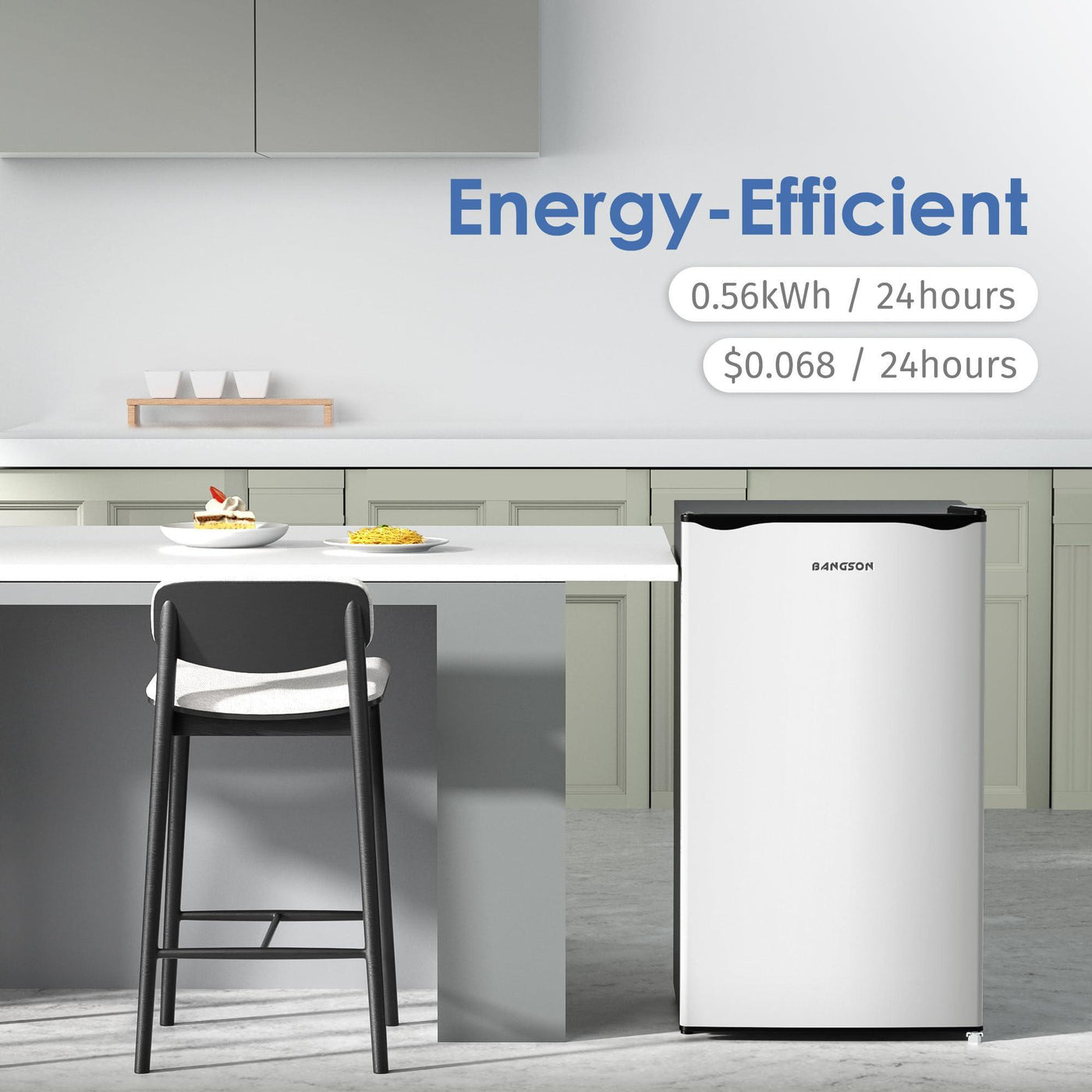 - Large Capacity: The BANGSON mini fridge offers 3.2 Cu.Ft (90L) of storage, including a freezer, in a compact single-door design. Measuring 18.7" x 17.4" x 33.07" (W x D x H) with just a 2.26 sq.ft footprint. Item height 33.7 inches. It maximizes space while providing more usable capacity than similar-sized double-door models. Perfect for dorms, offices, bedrooms, RVs, and garages.