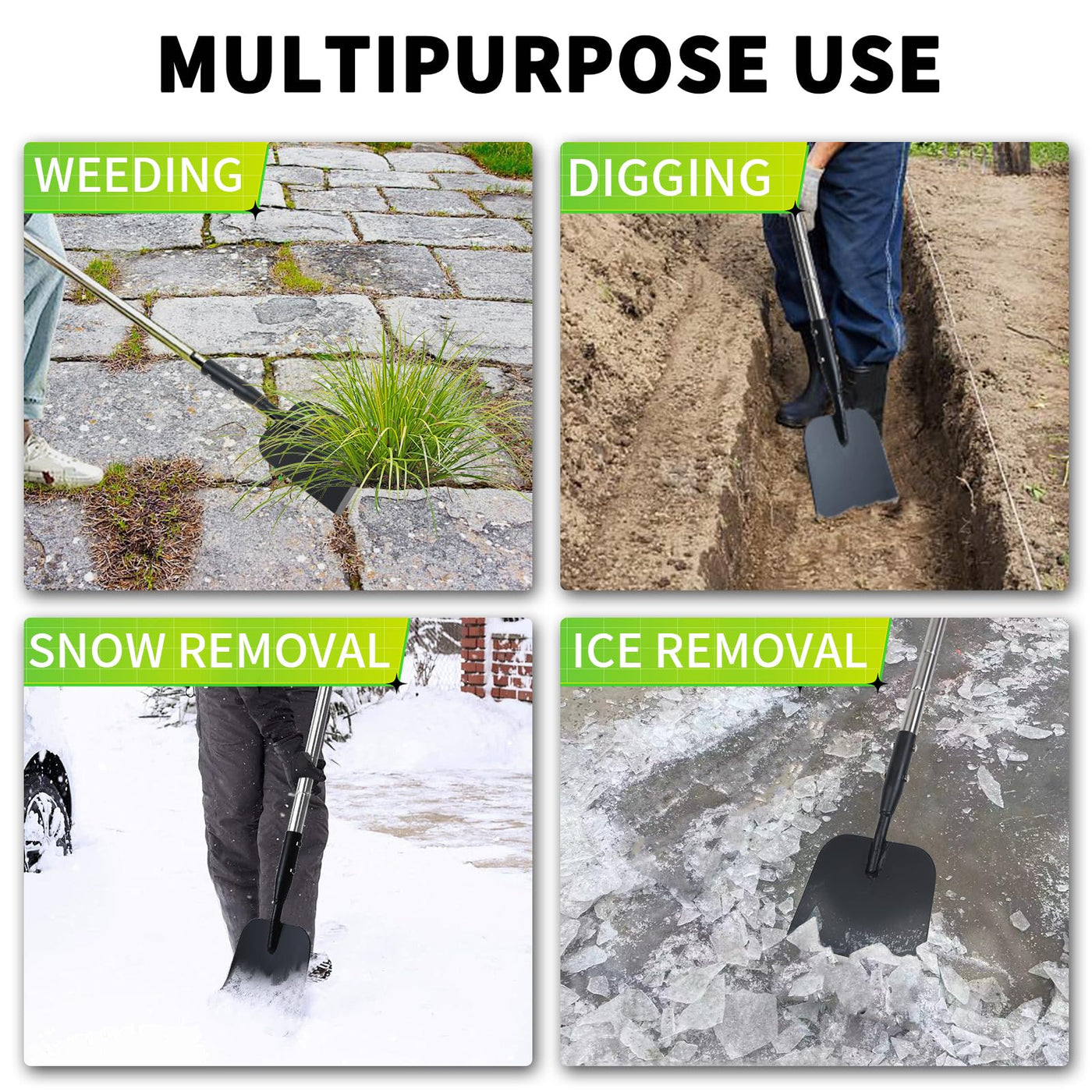 - Applicable All Year Round: Floor scraper can be used all year round. In addition to being used for snow removal and ice breaking in winter, it can be used to remove weeds, cut grass, dig holes, and level the ground in other seasons etc diverse experience