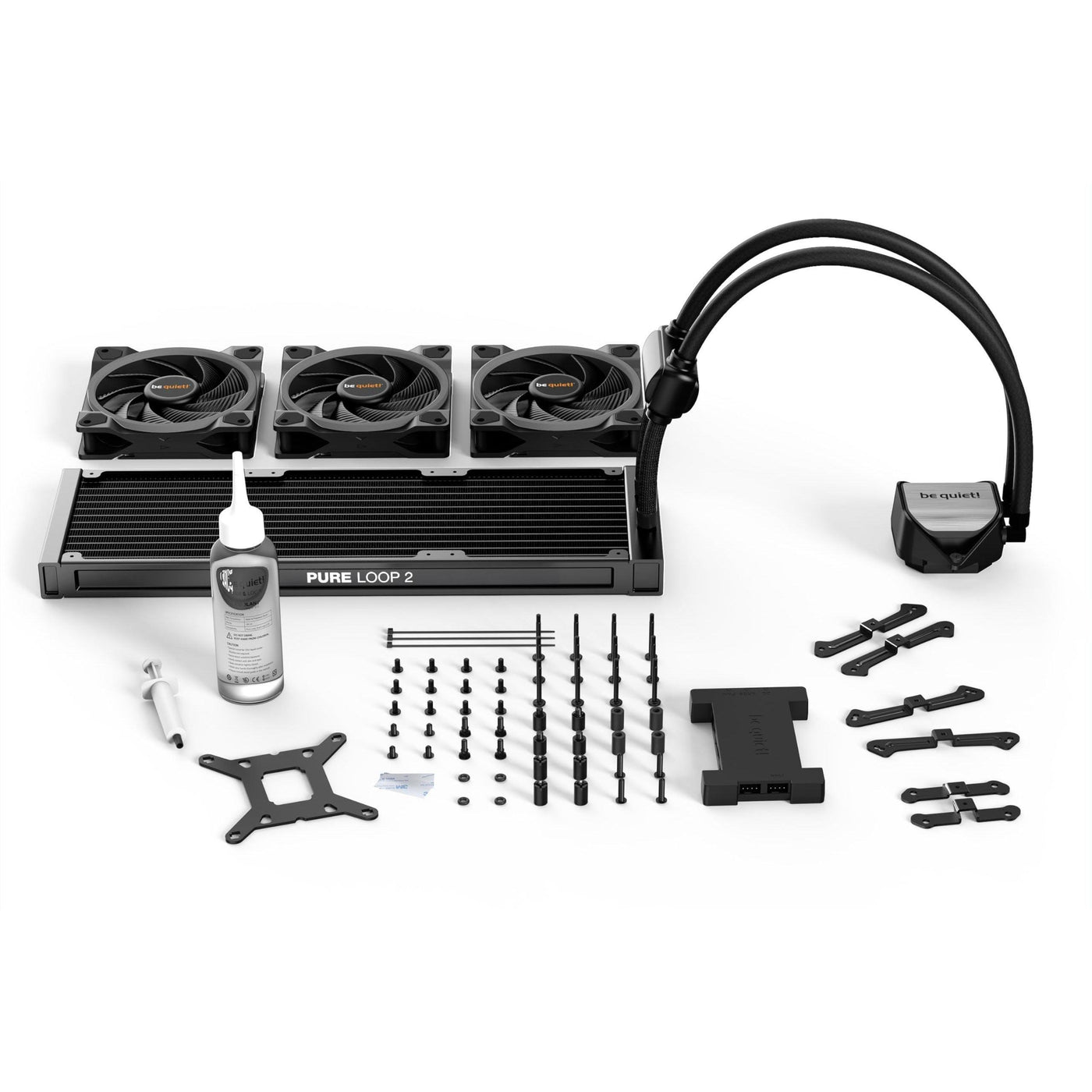 Details: Pure Loop 2 FX 360mm is the impressively high-performing and silent All-in-One water cooling unit with impressive ARGB illumination for overclocked systems. • Impressively high cooling performance for all consumer CPUs • 3 Light Wings 120mm PWM high-speed fans offer equally high air pressure and vibrant ARGB illumination • Doubly decoupled PWM pump for quiet operation and minimal vibration • ARGB-PWM-Hub enables synchronization of up to 6 ARGB components and PWM fans • Combination of ARGB illumination, all-black design and aluminum-style for unmistakable and stylish look • Easy-to-access refill port and included coolant bottle for a long lifespan