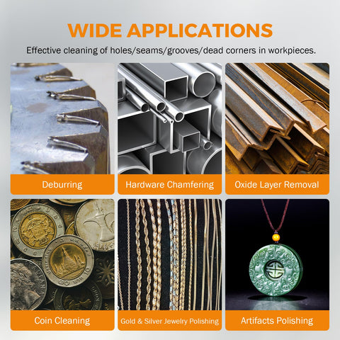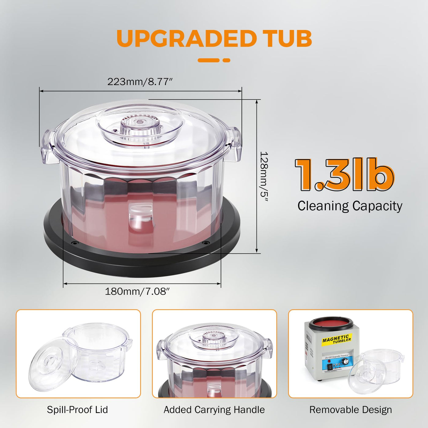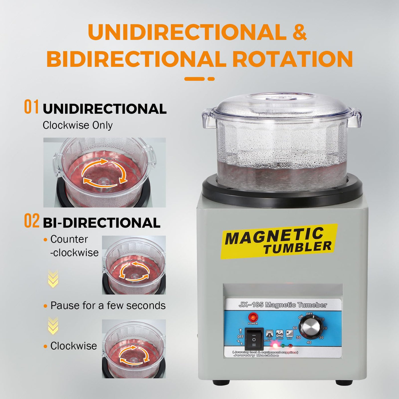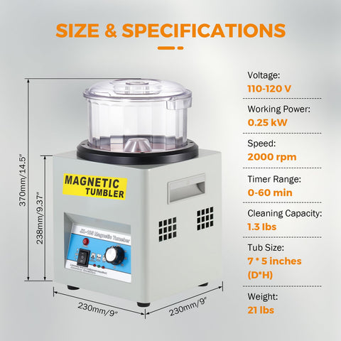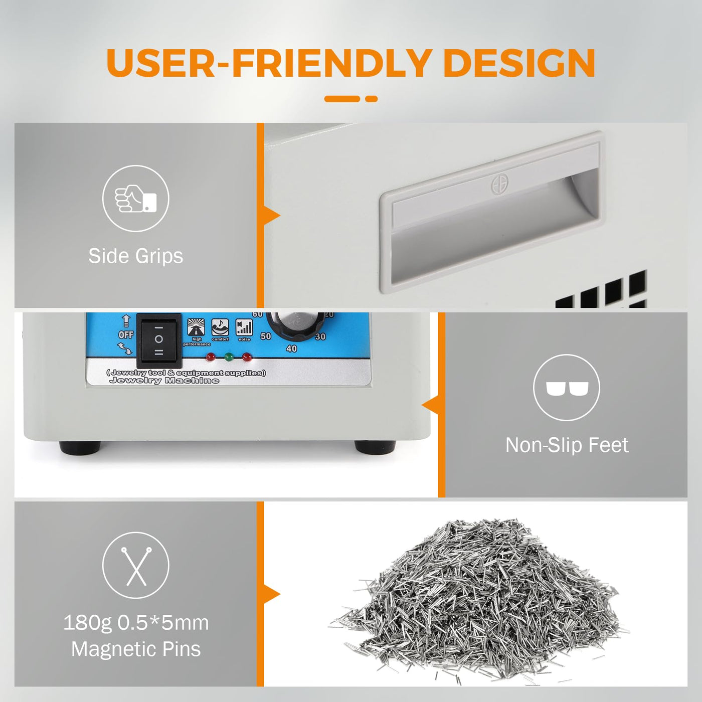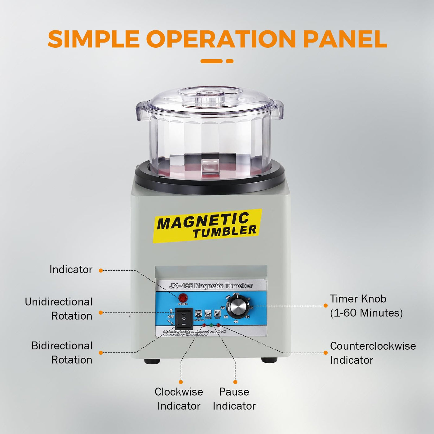 - Includes 1 magnetic tumbler machine and 180g (6.35oz) of 304 stainless steel polishing pins (each pin is 0.5mm x 5mm).