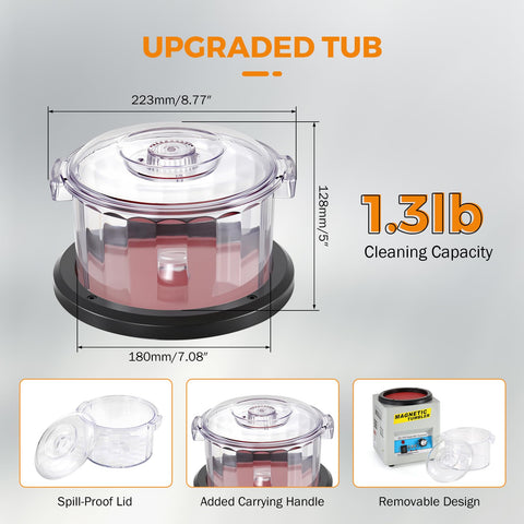 - Tub Size: 7 x 5 inches (180 x 128 mm). Machine Size: 9 x 9 x 14.5 inches (230 x 230 x 370 mm). Voltage: 110-120 V. Speed: 2000 RPM. Time Control: 10-60 minutes. Capacity: 1.3 lbs.