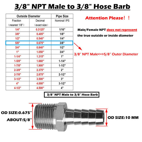 - This Fitting is 3/8" barb to 3/8" NPT male, suitable for hose tubing with 3/8" ID.