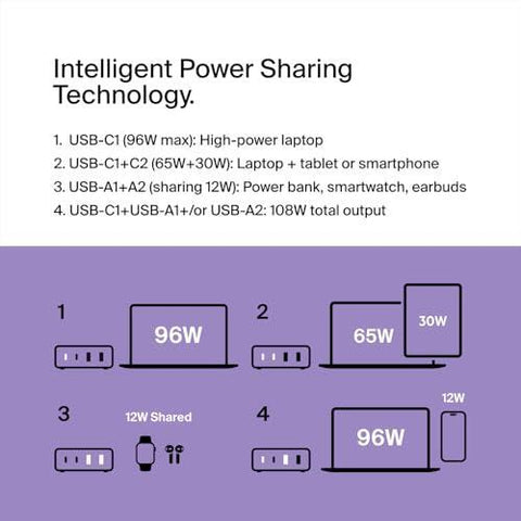 - SIMULTANEOUS CHARGING: Compared to other chargers with only one charging port, this 108W charger has 2x USB-C ports and 2x USB-A ports to fast charge up to 4 devices at once with its 4-port design. Charge your MacBook, smartphone, and more simultaneously