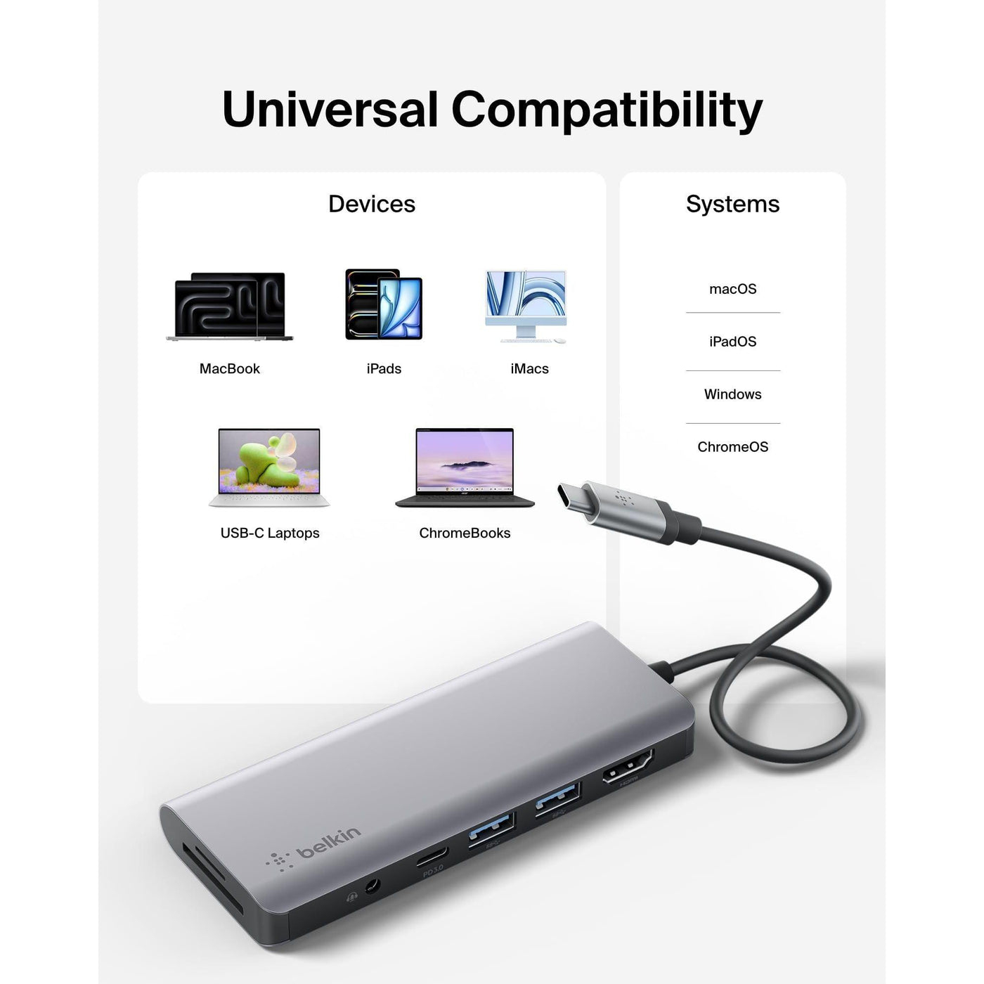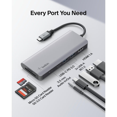 Details: Introducing the Belkin 7-in-1 MultiPort Docking Station - the ultimate docking solution for your Mac or Windows laptop. It has 7 ports to connect your MacBook or Windows laptop to multiple devices, providing video, ethernet, and power through a single USB-C Power Delivery 3.0 cable. Get up to 5Gbps data transfer speeds, keeping all of your devices connected together with the speed and power of USB 3.0. With pass-through charging up to 85W using Power Delivery, there’s no need to choose between port expansion and power. Immerse yourself in a smoother and clearer visual experience with up to 4k resolutions at 30Hz. The 7-in-1 MultiPort Docking Station expands the multimedia ports that have been eliminated in the latest Apple and PC laptops and connect to projectors, monitors, SD and MicroSD cards, headphones, microphones, and thumb drives.