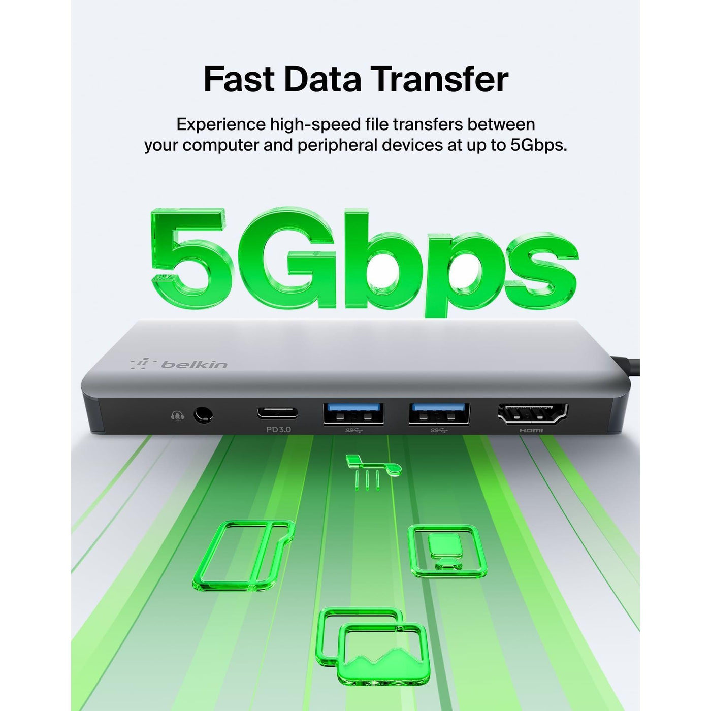- HIGH DATA TRANSFER SPEED CREATES THE ULTIMATE WORKSTATION: With 5Gpbs of data transfer and Power Delivery 3.0, the Belkin 7-in-1 MultiPort Docking Station can provide ultra-fast power and interconnectivity to all of your devices.