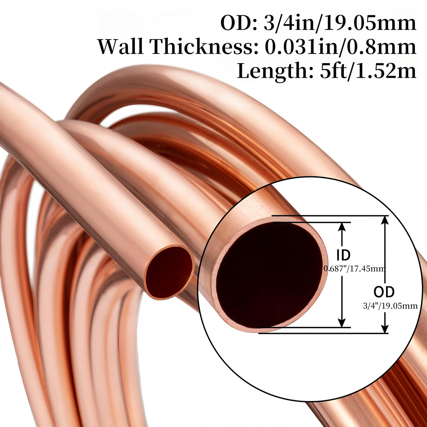- 【Specification】Annealed UNS C12200 Copper Tubing, 3/4" (19.05mm) OD x 0.687" (17.45mm) ID, Wall Thickness 1/32" (0.8mm), Length 5 ft (1.52m), Seamless, in Coil.