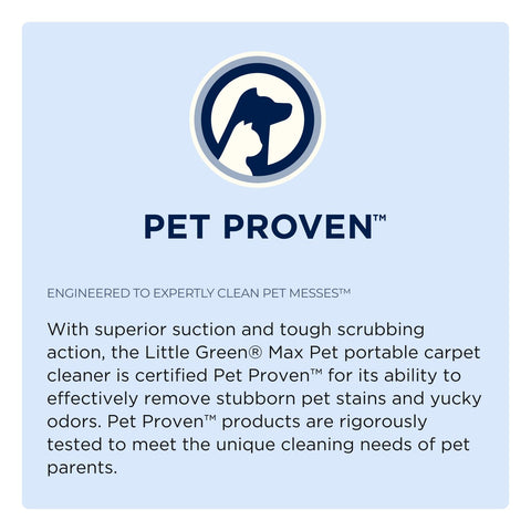 Details: Introducing the BISSELL® Little Green® Max Pet Portable Carpet & Upholstery Deep Cleaner, a cutting-edge machine designed with convenience in mind—especially for pet parents. This innovative cleaner uses a combination of superior suction and scrubbing action to permanently remove tough pet stains on soft surfaces and eliminate odors like pet urine. With a lightweight design, the Little Green® Max Pet is easy to use and store. This machine has a one-touch hose and tool cleaning function to provide a simple "clean-afterthe-clean" experience without having to change out your tool. BISSELL proudly supports BISSELL Pet Foundation® and its mission to help save homeless pets. When you buy a BISSELL® product, you help save pets, too. We’re proud to design products that help make pet messes, odors and pet homelessness disappear. *versus Shark® StainStriker™ and Dirt Devil® Portable Deep Cleaner based on ASTM F558 average peak air power through hose with connector covered