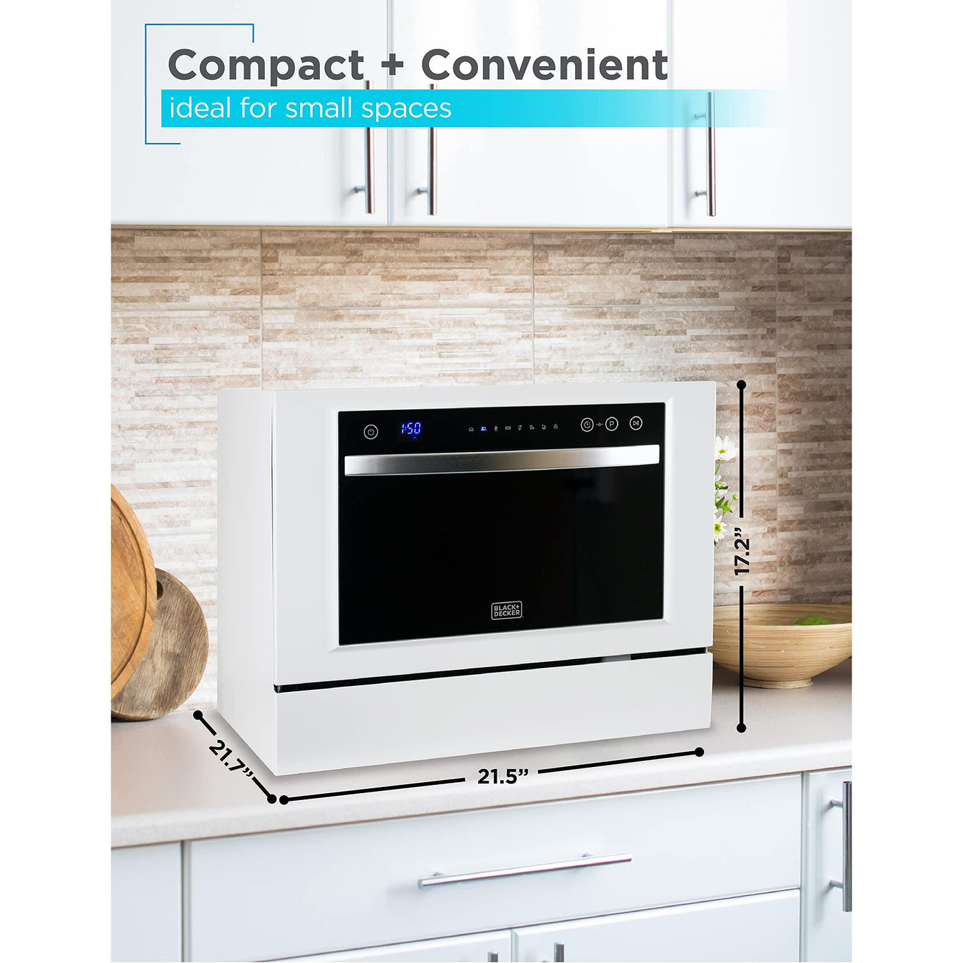 - 7 SUPERIOR WASH CYCLES: With this incredible BLACK+DECKER portable dishwasher, you find the right wash cycle that works for you and your dishes. Our 7 wash cycles for this 21.5” x 21.7” x 17.2” dishwasher machine include: Normal, Intensive, Eco, Glass, 90 Minutes, Rapid & Soak. Save water and time in the kitchen cleaning by letting this stainless steel dishwasher do all the hard work.