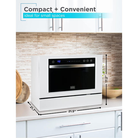 - OUTSTANDING DESIGN: The interior of this spacious portable dishwasher is stainless steel, guaranteeing immaculately cleaned dishes after every use. Also featured is an easy-to-grip handle, which makes for easy dish washer loading and unloading. This BLACK+DECKER commercial dishwasher fits on top of many countertops (46.2 lbs.) and stores conveniently in cupboards, pantries and kitchen shelves.