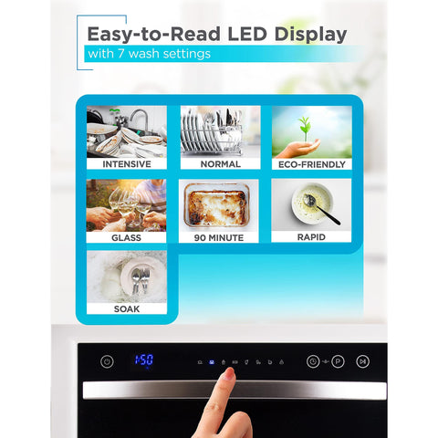 - LED DISPLAY: Set your wash cycle and time with ease thanks to this intuitive dish washer LED display. Thanks to its easy-to-navigate electronic touch controls, you can see remaining cycle time and even delay start time. Child lock included with portable dish washing machine to secure maximum safety.