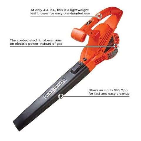 Details: The BLACK+DECKER LB700 corded blower features a 7 Amp Motor which provides a powerful & efficient blowing performance. This blower can move up to 180MPH/180CFM for fast & easy cleanup of leaves & debris. It also features built in cord retention prevents frustrating interruptions during cleanup. This unit is lightweight at only 4.4 lbs for easy one handed use. Includes: (1) LB700 7 amp blower, & (1) blow tube.