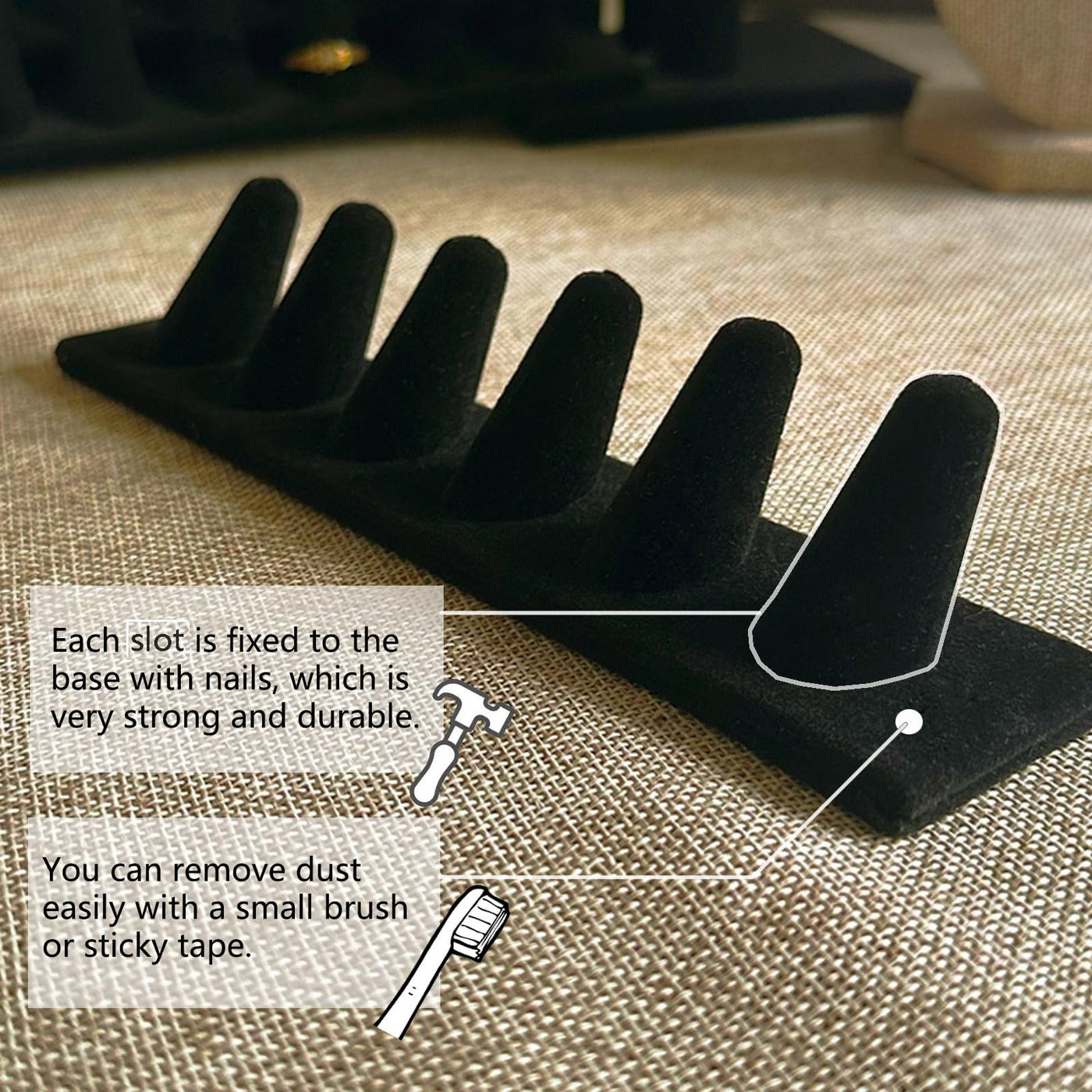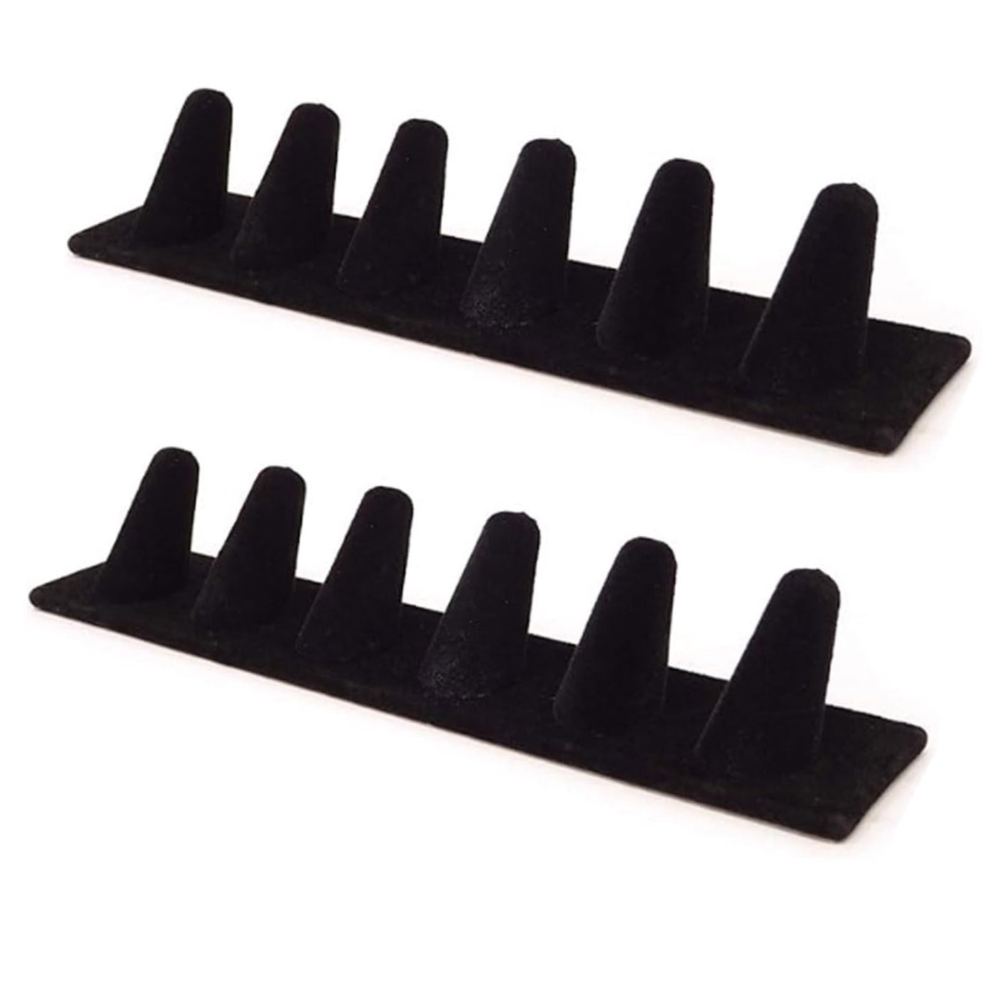 Details: This black velvet ring holder is a real gem. For your business, it's trulr an excellent jewelry display. Adds luxury to your displays and catches customers' eyes. The six positions hold rings securely, showing off quality and style. For personal use, it's a great organizer. Keeps your rings neat and accessible. Like a mini jewelry boutique at home. This ring holder can display large rings like championship rings and those with big jewels. Each ring finger-shaped solt is fixed to the base, and the gap between them fits any size rings. Ordinary ring trays can't hold large size rings. Two pieces are more cost-effective than one. Don't miss out!
