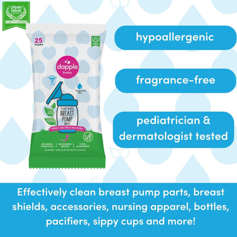Breast Pump Wipes by Dapple Baby, Hypoallergenic & Powered by Plants, Removes Milk Residue, Leaves No Taste, Convenient Wipes Pouch, Fragrance Free, 25 Count (Pack of 1)