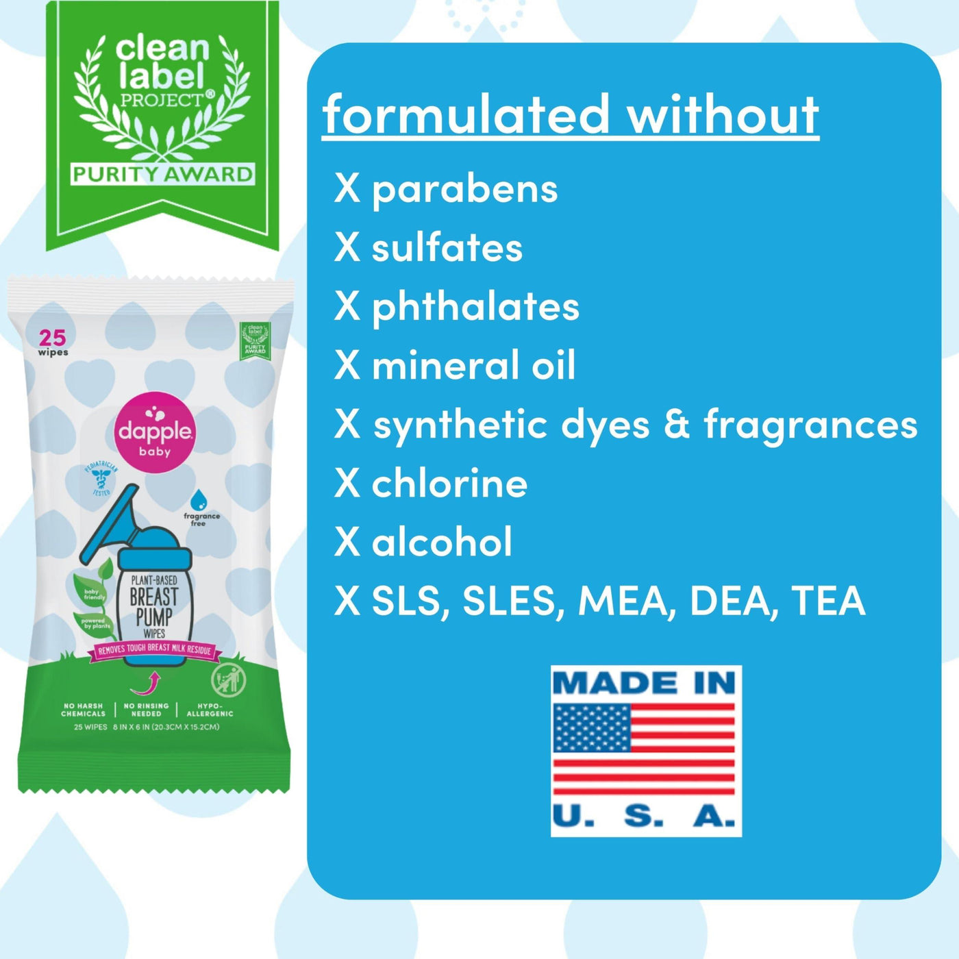 Breast Pump Wipes by Dapple Baby, Hypoallergenic & Powered by Plants, Removes Milk Residue, Leaves No Taste, Convenient Wipes Pouch, Fragrance Free, 25 Count (Pack of 1) Sale