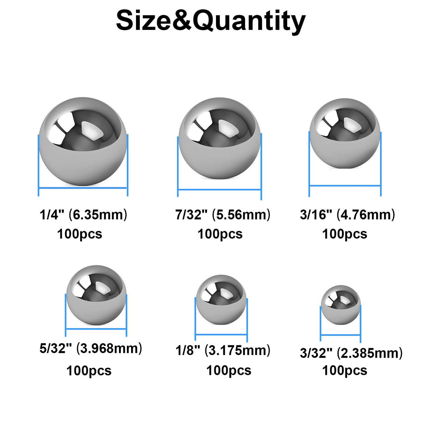 - ★Including: 100 balls each of the following sizes: 1/4" 7/32" 3/16" 5/32" 1/8" and 3/32" . Total is 600pieces.