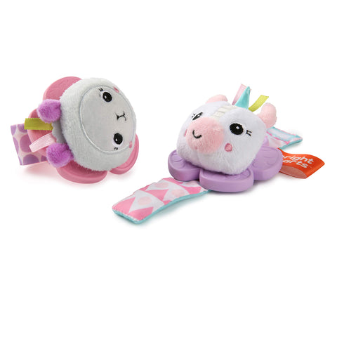 Details: It's time for a rattle. Her very first "watch" keeps playtime close at hand. These wearable wrist rattle toys from Bright Starts will delight your baby with every shake and hand-jiving dance move. The sweet pink and purple bracelets come with a crinkle unicorn and a rattling llama that your baby girl will love. When she needs to soothe sore gums, the teether flower petals provide comfort and relief. Go ahead and shake, shake, shake up playtime with this wearable baby toy.
