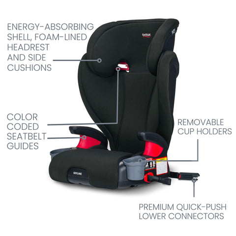 Details: Pair superior safety with a stylish design when you choose the Britax Skyline 2-Stage Belt-Positioning Booster Seat. It easily converts from a high back booster seat to a backless booster, so your child rides safer for longer. With its sleek, slim design, this booster car seat conveniently fits three across in most vehicles, while still providing spacious comfort for your kiddo. Quickly and easily position the vehicle's seat belt using the color-coded belt guides on this forward facing car seat. The protective seat shell and foam-lined headrest help absorb impact energy and are designed to help keep your child's head, neck, and body safe. The 10-position, quick-adjust headrest grows with your child. An easy-remove car seat cover makes cleanup a breeze, and two dishwasher-safe cup holders keep drinks and snacks within reach. With plush foam and built-in armrests, this booster seat helps your big kid enjoy the ride.