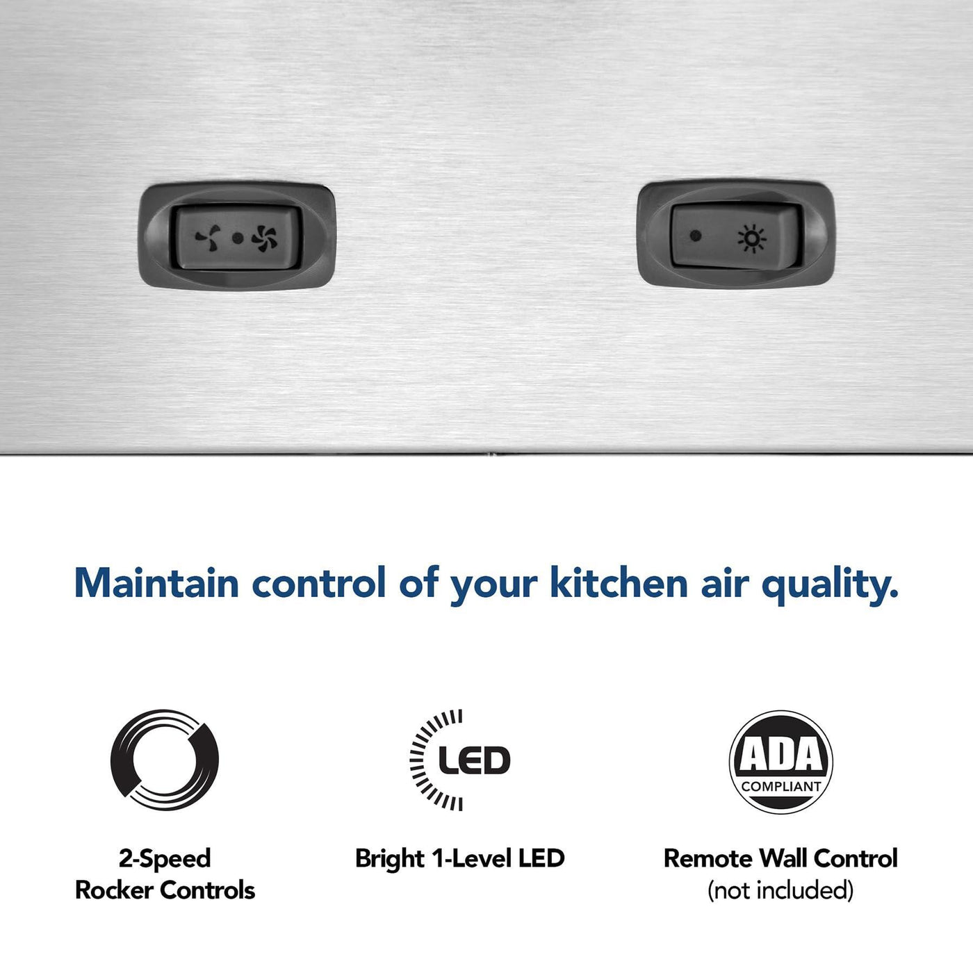 Details: Protect your cabinetry and keep your kitchen air clear and pure with the Broan-NuTone Custom Range Hood Insert. Perfect for custom kitchen designs and streamlined cabinet installations, this 30-inch one-piece insert protects the bottom of your cabinetry and looks great doing it- the flush design and depth adjustment capability make this stainless steel insert suitable for any kitchen appearance. This hood insert comes with EZ1 clips, making solo installation less daunting both for professional and DIY installers. This HVI certified range hood insert includes a two-speed rocker switch for convenience, and clears the air at a max blower speed of 300 CFM to remove smoke, grease, exhaust, and odor from your kitchen. This 11.44" x 30" x 2.81" insert is ADA compatible, and works in tandem with an optional remote wall control (sold separately), as well as optional universal make-up air dampers. It is UL listed, cUL listed, and can be used in compliance with LEED requirements. Operating at 3 sones of noise, this insert is about as loud as a typical conversation, so you won't have to yell over the sound. Featuring bright, 1-level LED lighting, this custom built-in range hood insert power pack makes evening cooking accessible and easy. The smooth, stainless steel surface and quick-release dishwasher-safe aluminum mesh filters allow for easier cleaning, and an optional non-duct filter kit (sold separately) eliminates the need for strenuous ductwork.
