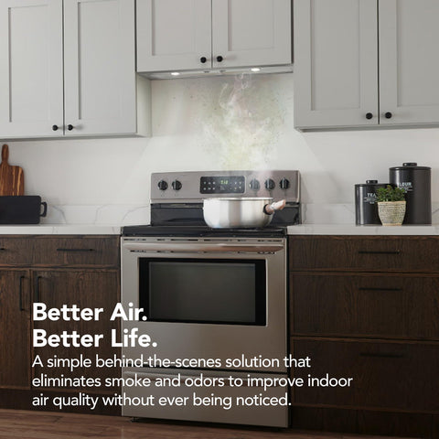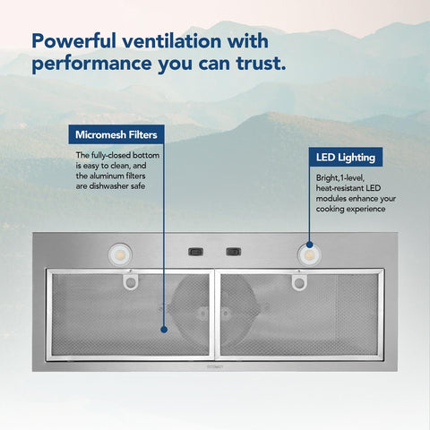 - BUILT-IN POWER PACK INSERT: This built-in power pack insert provides efficient ventilation for your kitchen, removing smoke & odors with the two-speed blower at 300 Max Blower CFM.