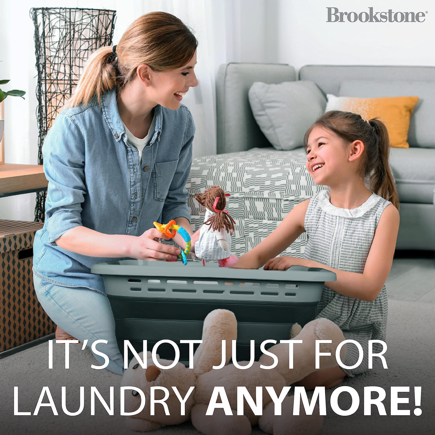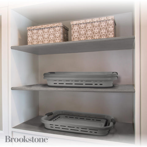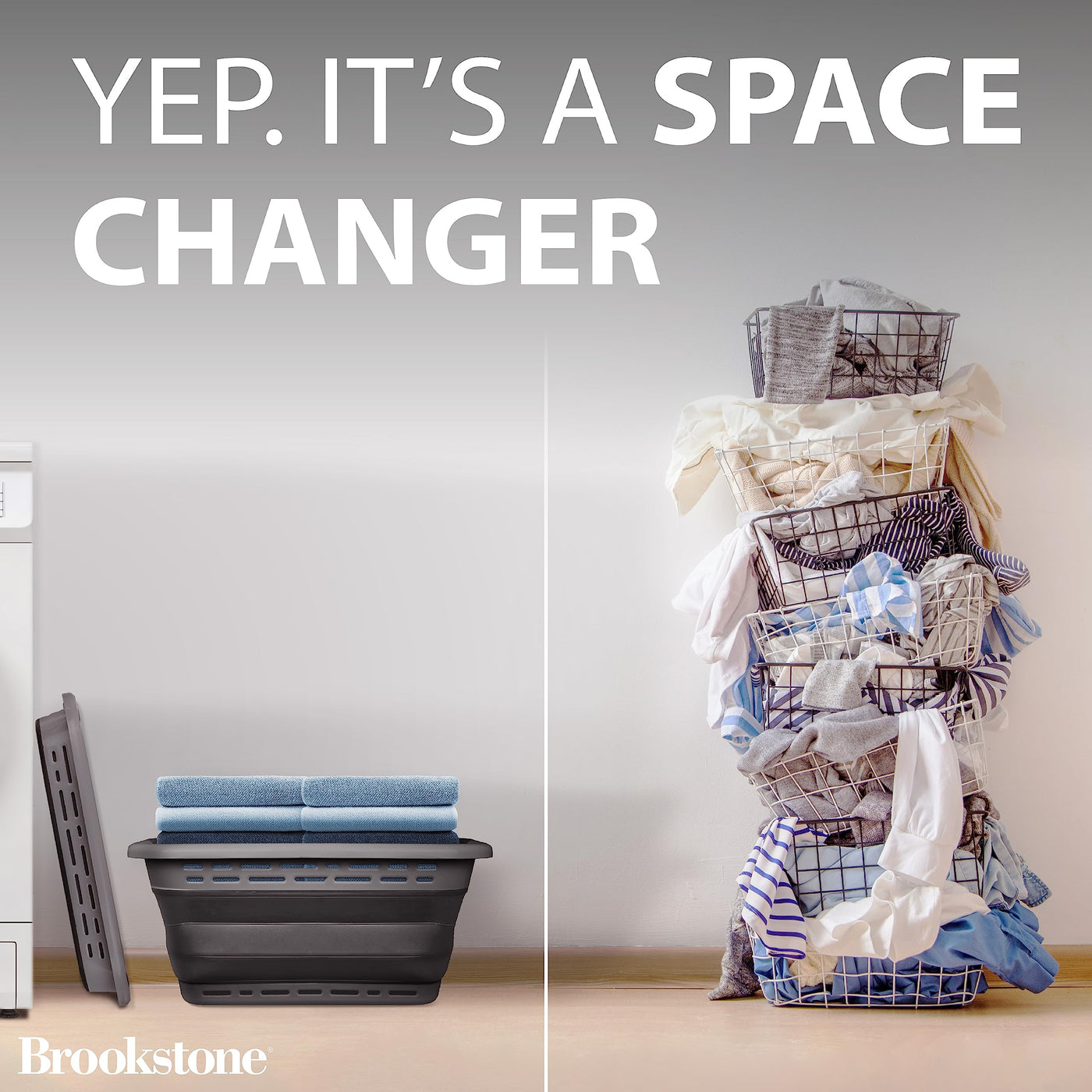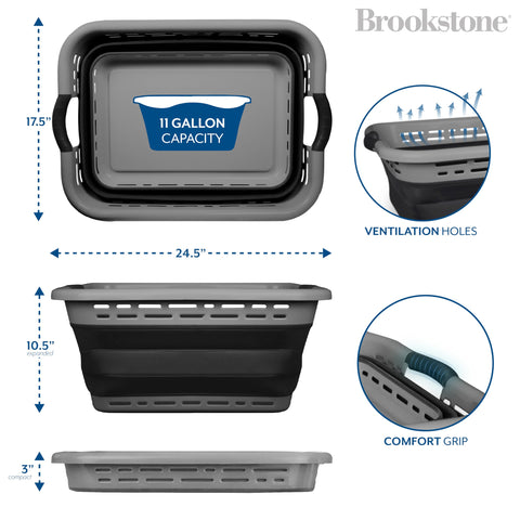 - COLLAPSIBLE LAUNDRY BASKET - Brookstone’s collapsible laundry basket combines both functionality and style. This space saving laundry basket simply folds flat when not in use for easy storage. Ideal for small spaces in your home, this laundry basket keeps your space organized and uncluttered.