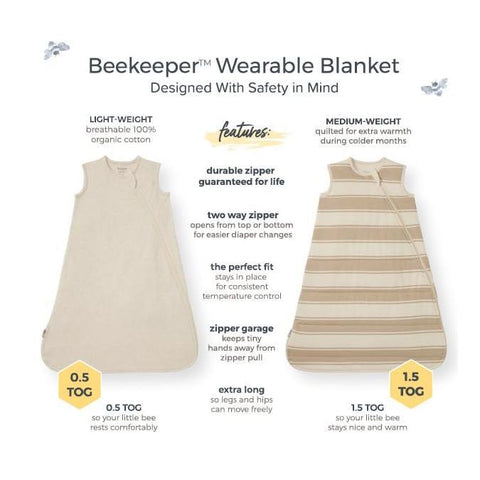 - Swaddle Transition Sleeping Bag: This thoughtfully designed Beekeeper wearable blanket will make your little bee feel comfortable in this classic design. Sleep bags are designed to replace loose blankets in the crib (as recommended by the American Academy of Pediatrics), this high-quality sack will keep your little bee warm through the night.