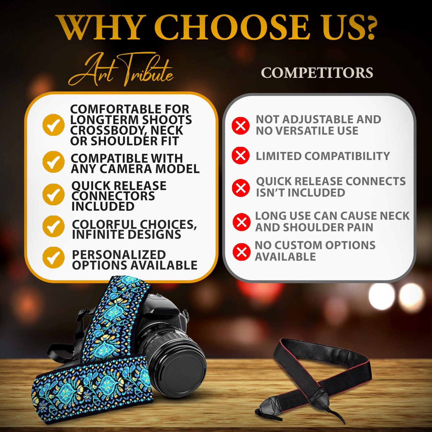 - HIGHEST QUALITY, UNIVERSAL FIT FOR ANY CAMERA – Quality is our mantra above all else. Art Tribute successfully blends, style, with durability and flexibility! You’ll love wearing this adjustable neck strap with an integrated cotton neck pad and meticulous stitching.