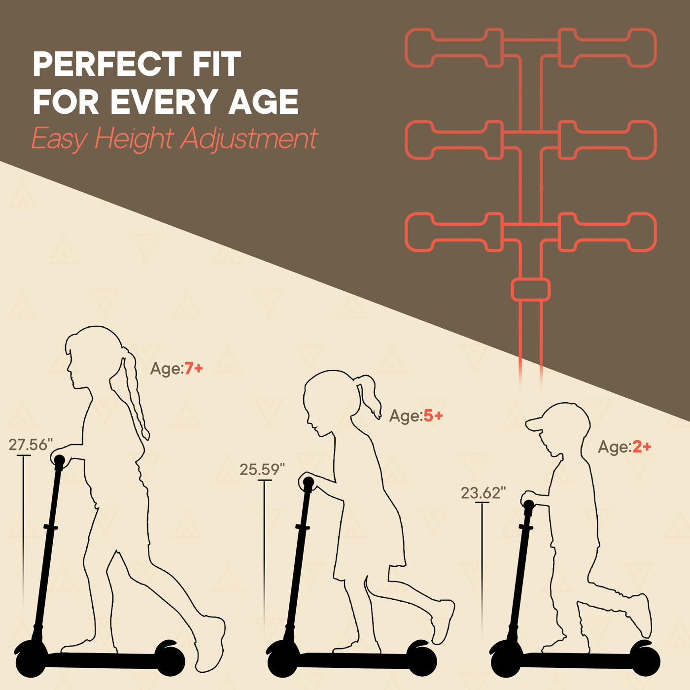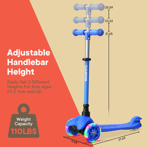- GROWS WITH YOUR CHILD – The adjustable T-bar handlebar offers four height settings (21.65’’, 23.62’’, 25.59’’, and 27.56’’ inches), making this scooter the perfect ride for as young as 2 years old and growing kids up to 110 lbs.