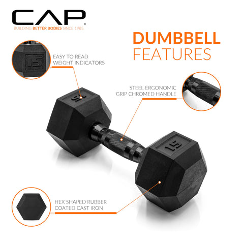 Details: The CAP Coated Hex Dumbbell Weight Pair with Black Handle, New Edition has been updated with robust packaging to ensure your dumbbell gets to you in great condition! Our dumbbell ends are made from ASTM A48 Class 20 grey iron with a durable coating and joined together by handle finished in a durable black coating, providing a strong, durable product that will last for years to come. Dumbbells are used to target all major muscle groups, including arms, chest, back, abs, legs and core – so they are essential for any home gym! The CAP Coated Hex Dumbbell Weight Pair offers many benefits when incorporated in exercise routines, which includes muscle building, improving core strength, boosting balance, providing better bone health, burning calories, increasing energy levels, enhancing overall mood and more. Use your CAP Coated Hex Dumbbell for essentially any exercise routine such as isolations, full body, functional, conditional, strength training, and HIIT workouts. Includes 30-day manufacturer warranty. **This item will be delivered in two separate boxes, which may arrive on different days or at different times.
