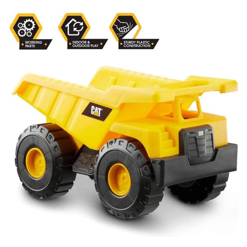 Details: Bring the construction site to the backyard with the Cat Construction Fleet Dump Truck. This rugged 10 inch truck features free rolling wheels and a working tilting bed ready to carry rocks blocks or sandbox sand. Built with the same Cat tough DNA as the real machines it uses thick durable plastic and oversized treaded tires to stand up to enthusiastic toddler play. Lightweight and safe for indoor living room highways yet strong enough for muddy driveway adventures the truck delivers screen free fun while building spatial awareness and cooperative play skills. Collect the rest of the Cat Construction Fleet to build a complete mini work crew including bulldozer excavator and wheel loader each sold separately.