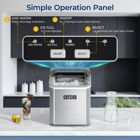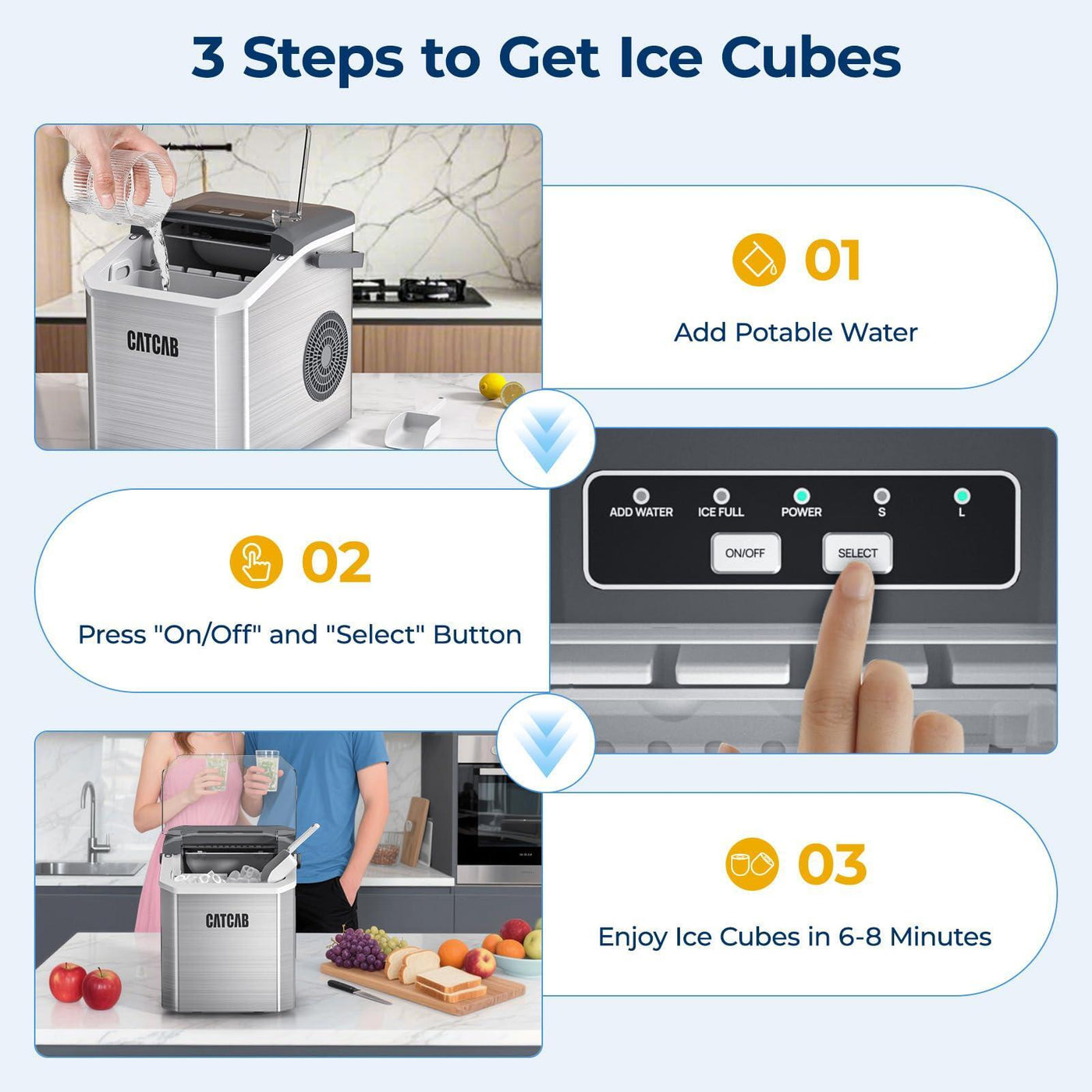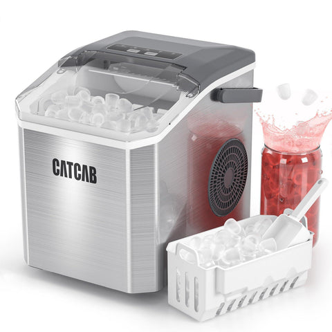 CATCAB Countertop Ice Maker Machine with Handle, 9 Ice Cubes in 6 Mins, 26.5Lbs/24H, 2 Sizes of Bullet Ice, Auto-Cleaning Portable Ice Machine for Home Kitchen Party RV Camping, Stainless Steel Silver Sale