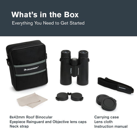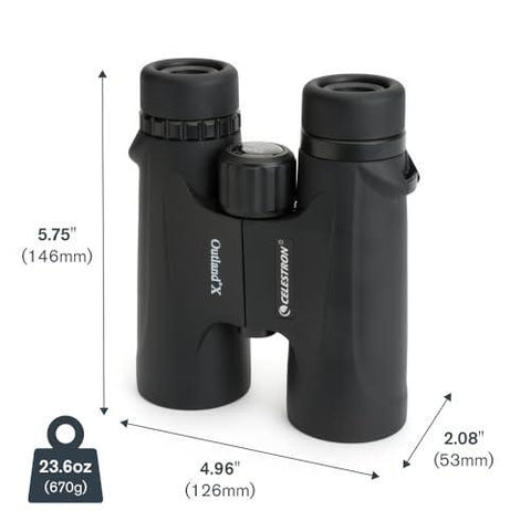 Celestron’s Outland X 8x42 binoculars are the perfect grab-and-go companion for your next outdoor adventure. Designed with portability and performance in mind, these compact binoculars combine rugged build quality with high-quality optics to deliver bright, detailed views wherever you go. With 8x magnification, the Outland X makes it easy to observe distant subjects—whether you’re birdwatching, hiking, or enjoying a game. Its 42mm objective lenses and fully multi-coated optics, the Nature DX 8x42 maximizes light transmission for bright, high-contrast views from dawn to dusk. Multi-coated optics improve light transmission for clearer views, while BaK-4 prisms enhance contrast and resolution. You’ll enjoy color-accurate images from sunrise to sunset, whether you're tracking birds in flight or scanning wide-open vistas. The ultra-wide 8.2° angular field of view lets you follow movement effortlessly and take in more of the scene at once. Built for the elements, Outland X binoculars are fully waterproof and fogproof—sealed and nitrogen-purged to perform reliably in changing weather conditions. The durable rubber-armored housing provides a secure, non-slip grip and added protection against bumps and drops. Twist-up eyecups ensure comfortable viewing for both eyeglass wearers and non-wearers alike, and the large, textured focus wheel makes it easy to achieve sharp focus even with gloved hands. Outland X 8x42 binoculars include a protective case, neck strap, lens covers, rainguard and objective lens caps, and a cleaning cloth—everything you need to take them from the trail to the stadium. Backed by Celestron’s Limited Lifetime Warranty and expert U.S.-based customer support.