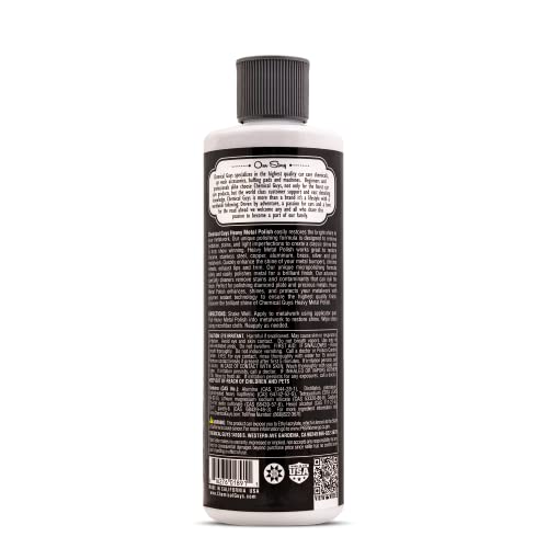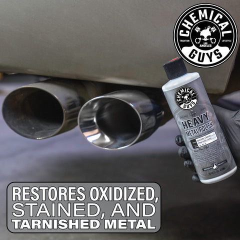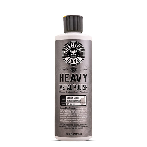 Details: Chemical Guys Vintage Heavy Metal Polish is a specialty metal polish designed to restore the brilliant shine to any metal surface. The all new Vintage Heavy Metal Polish is formulated with specialty cleaners to remove imperfections while restoring gloss and clarity. Chemical Guys Vintage Heavy Metal Polish works great to restore chrome, stainless steel, copper, aluminum, brass, silver and gold metalwork. Their unique micro-polishing formula safely polishes metal for a vibrant shine. The advanced protective polymers in Chemical Guys Vintage Heavy Metal Polish removes stains and environmental debris that can dull the finish. Heavy Metal Polish is perfect for polishing diamond plate and precious metals. Quickly and easily restore the original shine to your metalwork with Chemical Guys Heavy Metal Polish. Perfectly polished metalwork is the best compliment to any car, truck, boat, or motorcycle. Chemical Guys Vintage Heavy Metal Polish helps to achieve the brilliant shine that any detailing enthusiast enjoys. Simply apply a few drops of Vintage Heavy Metal Polish to a premium microfiber applicator pad and gently work into any chrome, aluminum, stainless steel, silver, gold, or copper surface to reveal a bright, high gloss shine. The advanced micro-abrasive technology quickly cuts through oxidation to produce a beautiful finish. Chemical Guys Vintage Heavy Metal Polish can also be used with the Chemical Guys Ball Buster System for even faster results when polishing wheels, diamond plate, and large metal surfaces. Vintage Heavy Metal polish is formulated with protective polymer technology that protects your metalwork from stains and oxidation.
