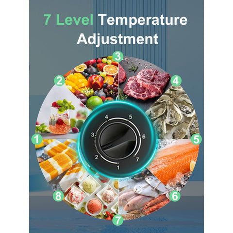 - ADJUSTABLE TEMPERATURE - 7 level temperature adjustment; Level 1-2: refrigerator temp from 32℉ to 50℉, best temp for beverage and fruits; Level 3-7: freezer temp from -11.2℉ to 32℉, suitable for meat, seafood, ice cream.