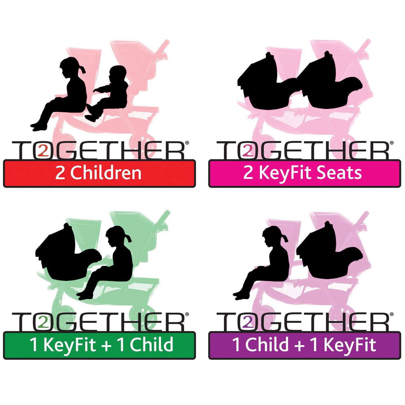 Details: For infants, the Cortina Together Double Stroller accepts any two Chicco infant car seats (sold separately), one in each seat. The front seat folds forward and the rear seat reclines to accept the car seat with integrated click-in attachment. No adapter needed!