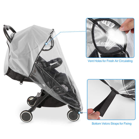 - BREATHABLE & CLEAR - With strategically placed air holes on both sides, our stroller rain cover ensures optimal air circulation, keeping your baby comfortable at all times. The see-through large window offers a crystal-clear view while allowing easy access to your baby in the stroller.