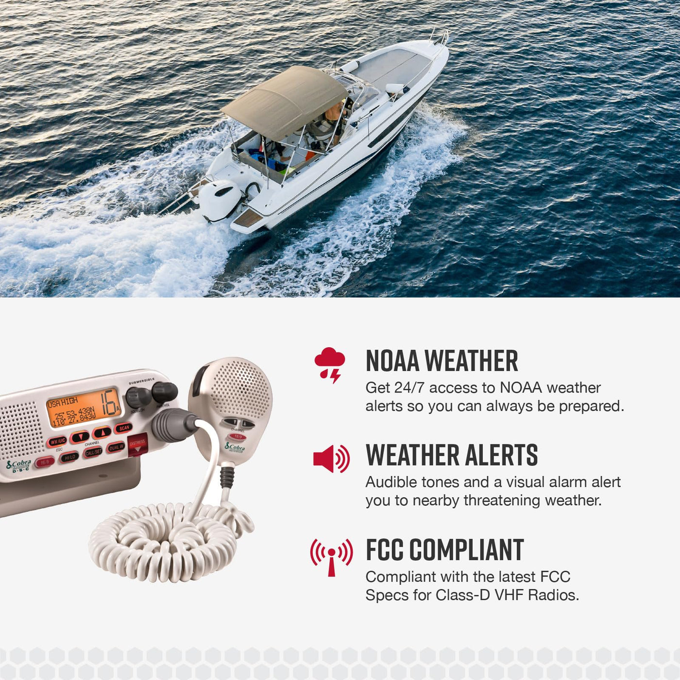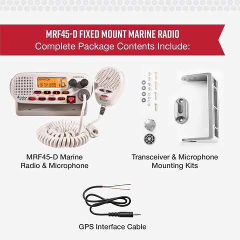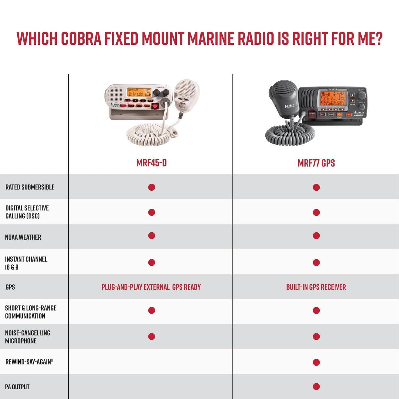 The MR F45-D includes all of the core features of Cobra's fixed mount radios like; Noise canceling microphone, NOAA Weather Radio, Weather Alert, JIS7 Submersible, Instant channel 16/9, Scan, DSC call log, External speaker jack, Illuminated LCD display, Signal strength meter, GPS input capability, etc. Compliant with the latest FCC specifications for Class-D VHF Radios.
