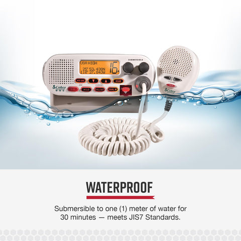 The Cobra MR F45 is a full function DSC-capable VHF radio. The selectable 1 or 25 Watt output is perfect for short or long-range communication. This unit has features usually reserved for more costly VHF radio units including Dual Watch, an adjustable backlight, and function keys on the mic. Includes