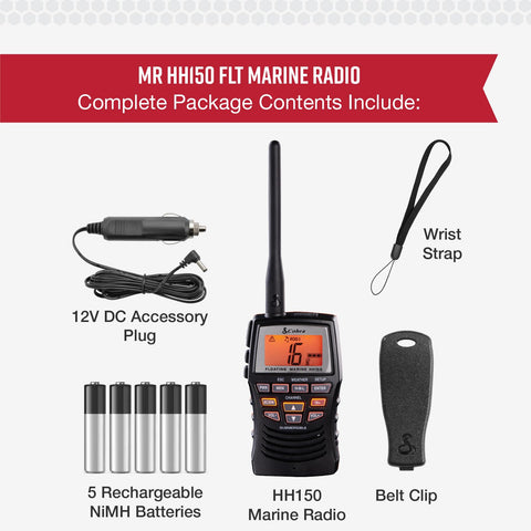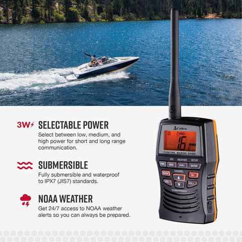 Cobra VHF Marine Radio - MR HH150 FLT - 3 Watt, Floating, Long Range, Handheld, NOAA, International, Waterproof, Submersible, Weather Alerts, LCD Screen, Belt Clip