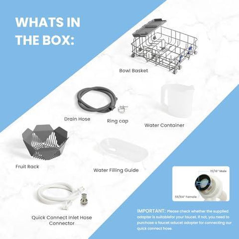 - [ No installation needed ]: Adding water manually in the upgraded 6 Liter built-in water tank, you can put the dishwasher in any suitable place without connecting to tap water. Or it can be hooked to the kitchen faucet directly with the included quick connect water hose (Adapter included).