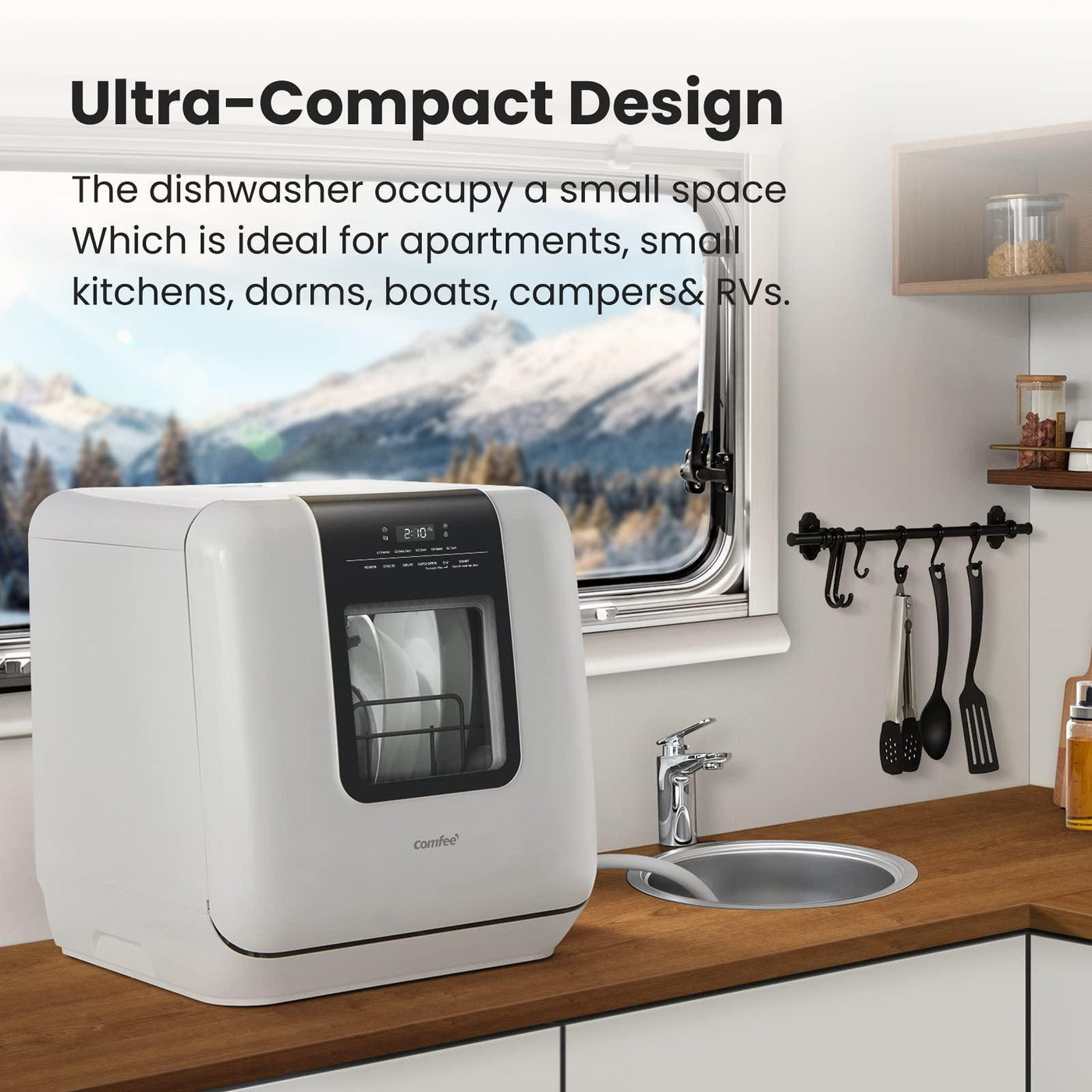 Details: If you don’t want to spend a lot of time scrubbing dirty dishes but are short on space in your kitchen, COMFEE' countertop dishwasher can be a life saver! No need to install. Just connect the dishwasher to a water tank or faucet yourself. The mini dishwasher has upgraded inside space, which can hold up 10.5-inch plates. It also has 2 enhanced functions: AUTO-OPEN provides effective drying performance; UV Hygiene Program ensures there will be no food particles left behind.